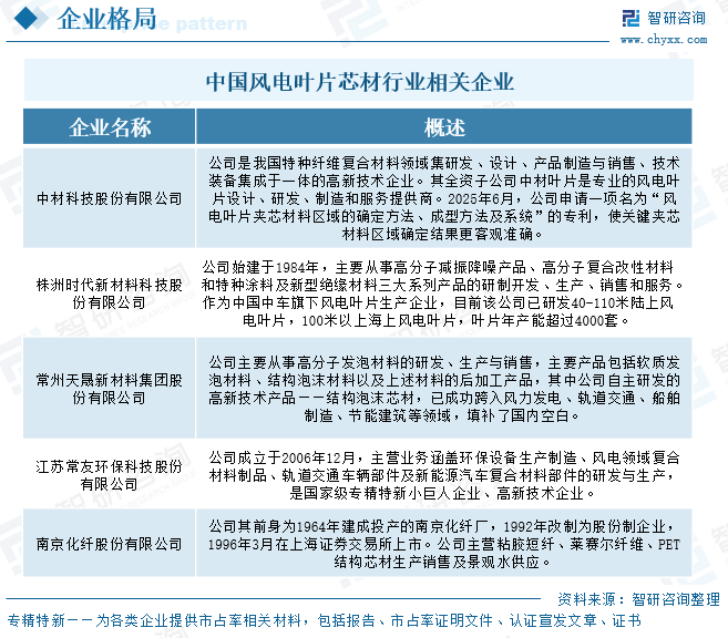 目前,风电叶片芯材行业企业主要包括风电叶片生产企业和专业生产风电叶片芯材的企业。其中风电叶片生产企业主要包括中材科技、时代新材等,这些企业在风电叶片的基础上,积极布局风电叶片芯材,通过垂直整合产业链来降低成本、提高竞争力。专业生产风电叶片芯材的生产企业主要包括天晟新材、常友科技、南京化纤等,这些企业在风电叶片芯材方面拥有专业的技术团队和生产线,能够为客户提供高质量的产品。随着行业的不断发展,风电叶片芯材市场竞争将越来越激烈,企业需要不断提升产品质量和技术水平,以提高自身的竞争力。
