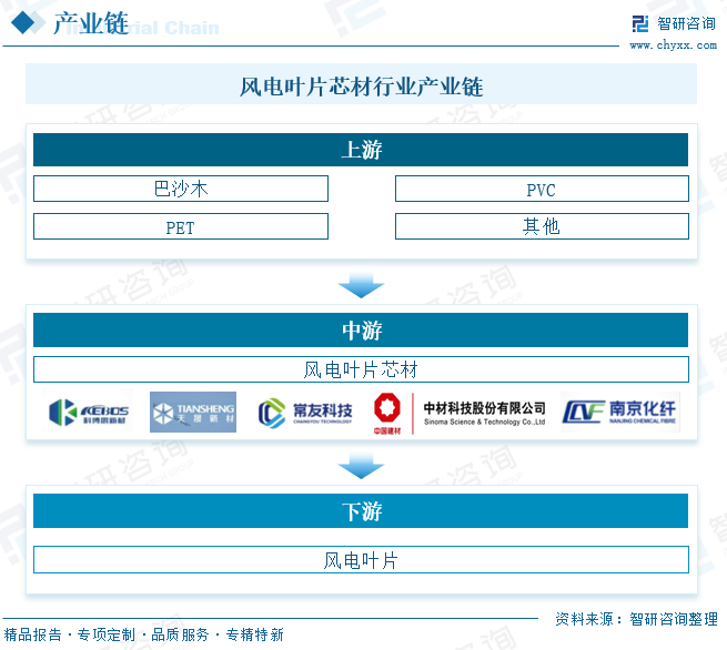 从产业链来看,风电叶片芯材行业上游原材料主要包括巴沙木、PVC、PET等,其中,巴沙木是主要原材料,但由于巴沙木主要分布在热带国家的低海拔地区,因此我国进口依赖程度较高。中游是指风电叶片芯材的生产制造,该环节的生产商负责将上游的原材料加工制造成成品。下游是指应用领域,即风电叶片行业。