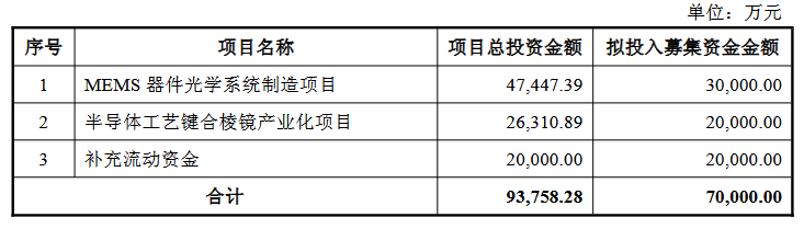 半导体工艺键合棱镜产业化项目拟投入金额2.63亿元,其中拟使用募集资金投入2亿元。项目产品主要应用于手机潜望式长焦镜头等光学领域,可显著提升手机摄像头的光学变焦能力与成像质量。