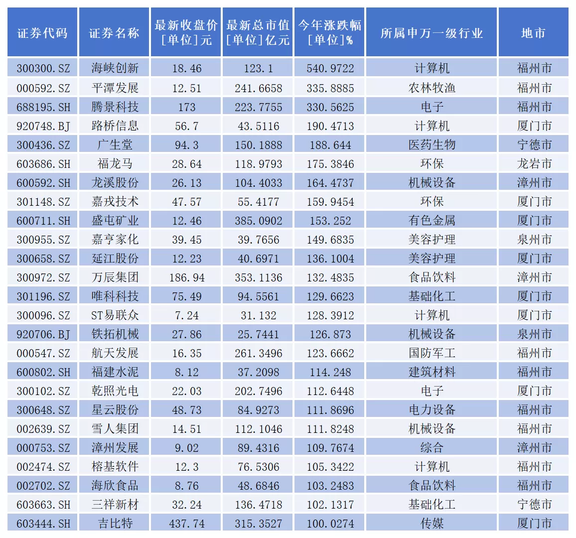 从二级市场表现看,截至12月收盘,今年以来,已有25家上市公司年内股价成功实现翻倍。具体包括:海峡创新、平潭发展、腾景科技、路桥信息、广生堂、福龙马、龙溪股份、嘉戎技术、盛屯矿业(维权)、嘉亨家化、延江股份、万辰集团、唯科科技、ST易联众(维权)、铁拓机械、航天发展、福建水泥、乾照光电、星云股份、雪人集团、漳州发展、榕基软件、海欣食品、三祥新材、吉比特。