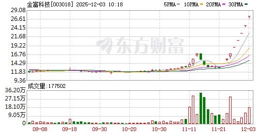 金富科技盘中涨停,已连收8个涨停板,截至9:25,该股报27.31元,换手率4.24%,成交量415.73万股,成交金额1.14亿元,涨停板封单金额为2211.27万元。连续涨停期间,该股累计上涨114.36%,累计换手率为78.88%。最新A股总市值达71.01亿元,A股流通市值26.76亿元。