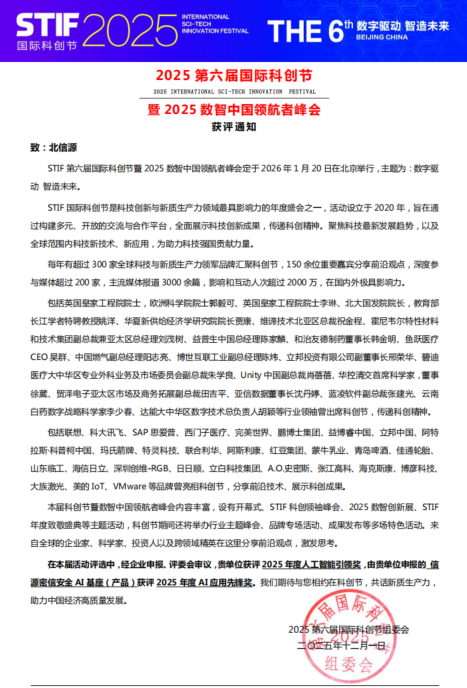第六届STIF国际科创节是科技创新与新质生产力领域的年度盛会,本届科创节吸引了联想、海信、科大讯飞、北信源等超过 300 家科技与新质生产力知名企业参与。其奖项评选以“创新力、影响力、推动力、社会责任、前瞻性”为核心标准,经过严苛的企业申报与评委会审议。