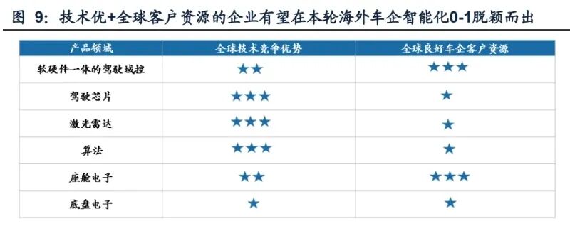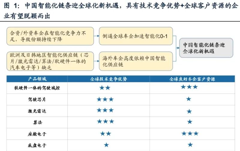 看好本轮海外车企智能化0-1,中国智能化链条迎全球化新机遇。合资和外资 车企在智能化竞争力不足,中国品牌不断抢占份额,倒逼全球车企加速智能化0- 1。欧洲及日韩地区智能化供应链体系(芯片/激光雷达/算法/软硬件一体的汽车电 子等)缺乏,海外车企高度依赖中国智能化供应链。我们认为具备全球技术竞争优 势和良好全球客户资源的企业,有望在本轮产业趋势中率先脱颖而出。受益海外车 企智能化0-1的领域排序如下:软硬件一体的驾驶域控~座舱电子>驾驶芯片~激光 雷达~算法>底盘电子。