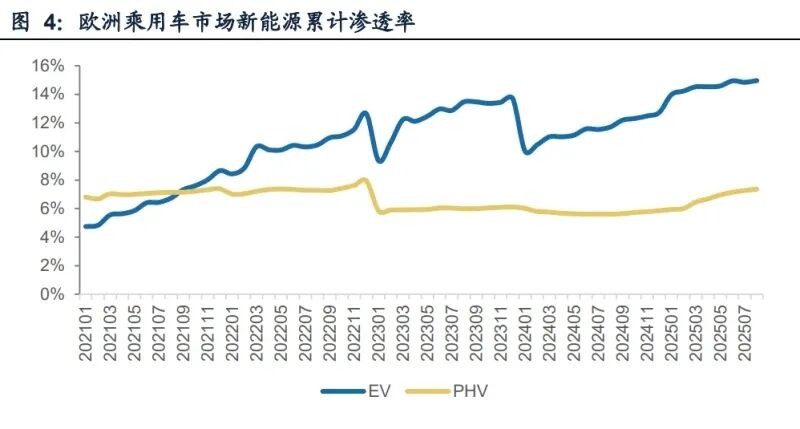 随着在中国和全球市场,海外车企份额持续下降,倒逼海外车企加速新能源和 智能化转型,提升产品竞争力。经过多年发展,随着新能源优质车型供给增加,消费者对新能源汽车的认知度和接受度不断提升,自年初以来,海外新能源汽车渗透 率呈现快速提升趋势。以欧洲市场为例,根据MarkLines,2025年1-8月欧洲新能 源乘用车累计渗透率22.4%/同比+5.0pct,其中,纯电动乘用车累计渗透率15.0%/ 同比+3.3pct,混合动力乘用车累计渗透率7.4%/同比+1.7pct。同理,我们认为随着 海外车企加速智能化转型,带来智能汽车优质车型供给增加,叠加消费者对智能汽 车的认知度和接受度不断提升,汽车智能化将接棒电气化进程。