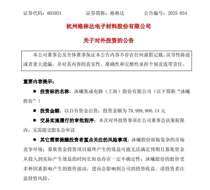 12月3日,浙江上市公司格林达(603931.SH)发布公告称,公司将作为战略投资者,以自有资金参与认购沐曦股份(688802.SH)首次公开发行战略配售的股票。