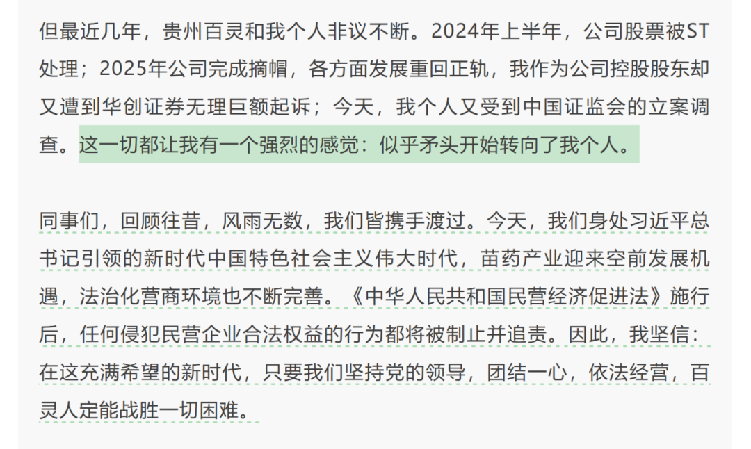 而就在12月3日,姜伟的公开信发布的几个小时前,贵州百灵还发布公告称,公司实际控制人姜伟于近日收到中国证监会下发的《立案告知书》,因涉嫌内幕交易、信息披露违法、违反限制性规定转让股票,中国证监会决定对其进行立案。