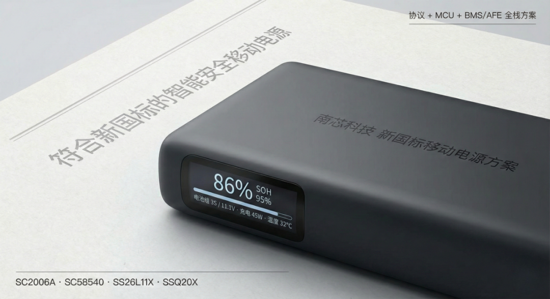 对品牌和 OEM 厂商而言,这套由 SC2006A、SC58540、SS26L11X 与 SSQ20X 搭建的平台,可以在新国标移动电源项目中直接落地复用,并平滑延伸到大容量移动电源、小型充电宝等更广泛的电池应用形态,在同一技术栈下完成整个产品系列的安全与智能升级,抢占智能移动电源新一轮增长机遇。
