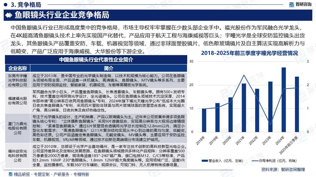 竞争情况:中国鱼眼镜头行业已形成高度集中的竞争格局,市场主导权牢牢掌握在少数头部企业手中。福光股份作为军民融合光学龙头,在4K超高清鱼眼镜头技术上率先实现国产化替代,产品应用于航天工程与海康威视等巨头;宇瞳光学是全球安防监控镜头出货龙头,其鱼眼镜头产品覆盖安防、车载、机器视觉等领域,通过非球面塑胶镜片、低色散玻璃镜片及自主算法实现高解析力与低畸变,产品广泛应用于海康威视、大华股份等下游企业。