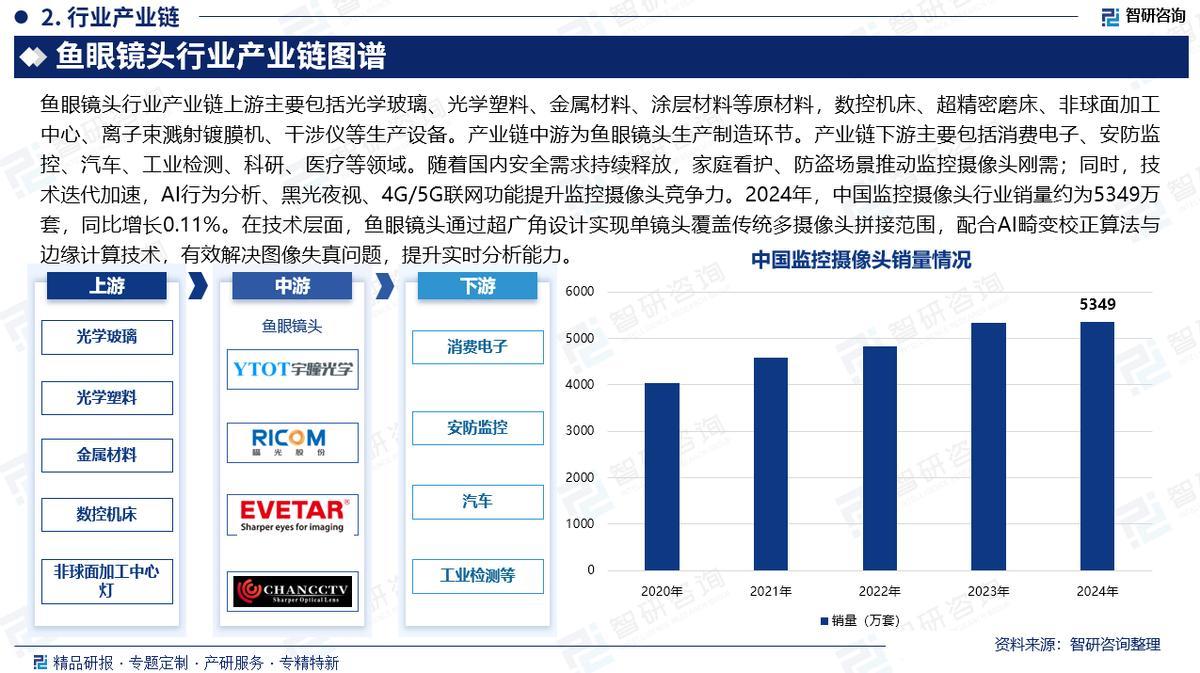 产业链核心节点:随着国内安全需求持续释放,家庭看护、防盗场景推动监控摄像头刚需;同时,技术迭代加速,AI行为分析、黑光夜视、4G/5G联网功能提升监控摄像头竞争力。2024年,中国监控摄像头行业销量约为5349万套,同比增长0.11%。在技术层面,鱼眼镜头通过超广角设计实现单镜头覆盖传统多摄像头拼接范围,配合AI畸变校正算法与边缘计算技术,有效解决图像失真问题,提升实时分析能力。