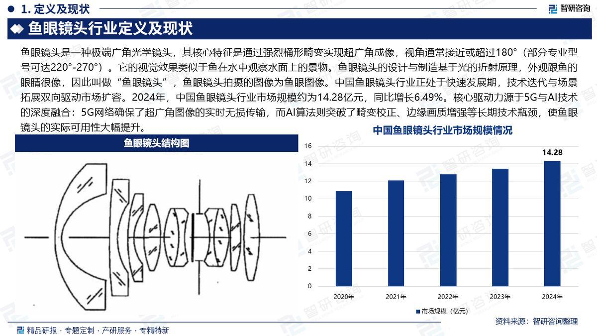 市场规模:中国鱼眼镜头行业正处于快速发展期,技术迭代与场景拓展双向驱动市场扩容。2024年,中国鱼眼镜头行业市场规模约为14.28亿元,同比增长6.49%。核心驱动力源于5G与AI技术的深度融合:5G网络确保了超广角图像的实时无损传输,而AI算法则突破了畸变校正、边缘画质增强等长期技术瓶颈,使鱼眼镜头的实际可用性大幅提升。