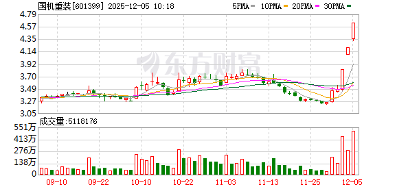 国机重装盘中涨停,已连收3个涨停板,截至9:44,该股报4.63元,换手率4.85%,成交量3.50亿股,成交金额15.92亿元,涨停板封单金额为1.67亿元。连续涨停期间,该股累计上涨33.05%,累计换手率为15.08%。最新A股总市值达333.99亿元。
