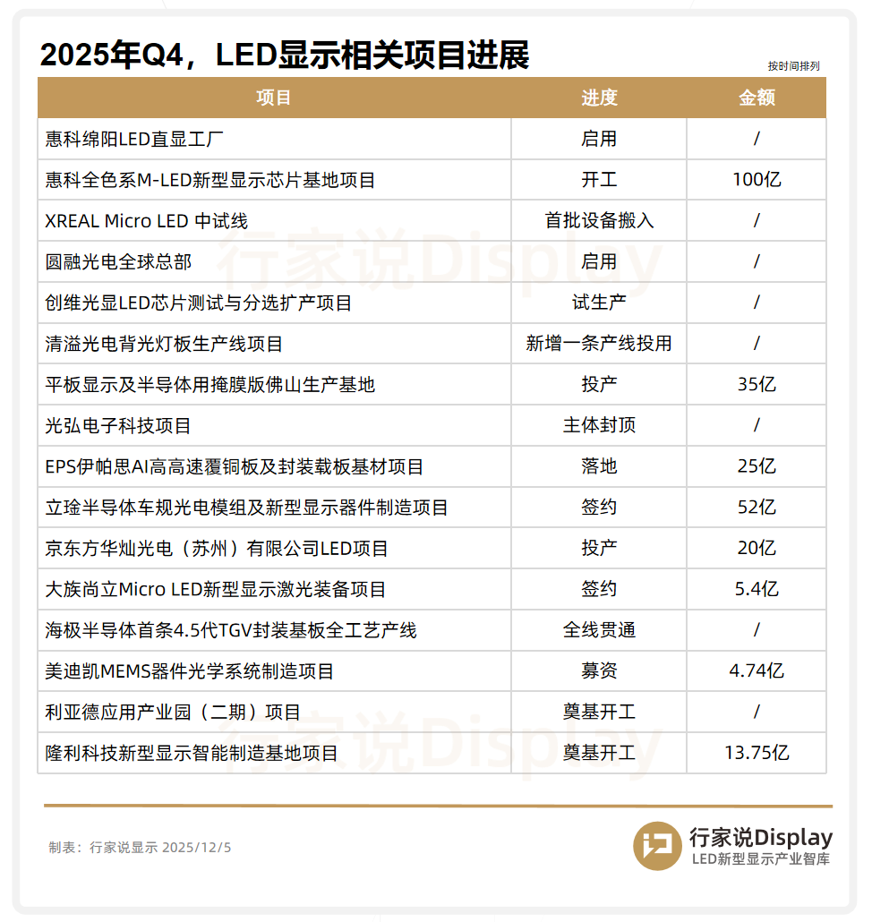 2025年以来,MLED显示领域投资建设热度持续攀升。进入第四季度,多个项目进入启用、开工等新阶段。相关项目及进度如下: