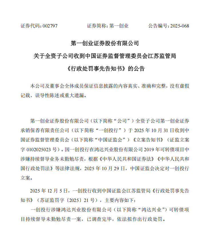 10月31日晚间,第一创业公告,一创投行收到中国证监会《立案告知书》(证监立案字0102025023号)。因一创投行在鸿达兴业股份有限公司(简称“鸿达兴业”)2019年可转债项目中,涉嫌持续督导业务未勤勉尽责,中国证监会决定对一创投行立案。