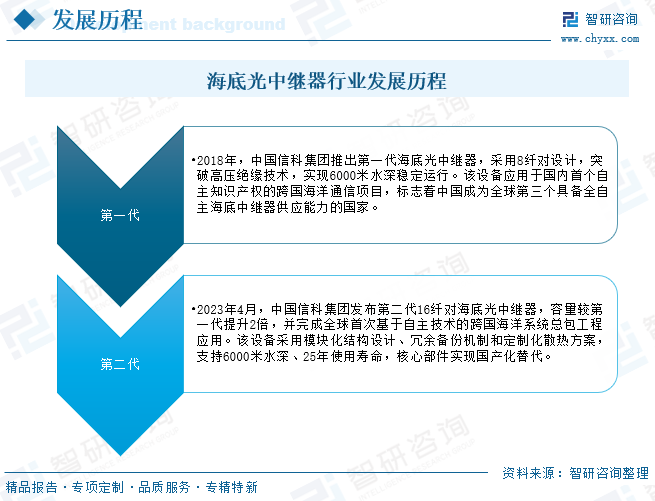 海底光中继器行业的发展历程可以追溯到海底光缆通信技术的兴起。随着全球对大容量、长距离通信需求的不断增长,海底光缆通信技术得到了迅速发展,海底光中继器作为其中的重要组成部分,也随之得到了广泛的研究和应用。截至目前,海底光中继器开发了两代产品:2018年,中国信科集团推出第一代海底光中继器,采用8纤对设计,突破高压绝缘技术,实现6000米水深稳定运行。该设备应用于国内首个自主知识产权的跨国海洋通信项目,标志着中国成为全球第三个具备全自主海底中继器供应能力的国家。2023年4月,中国信科集团发布第二代16纤对海底光中继器,容量较第一代提升2倍,并完成全球首次基于自主技术的跨国海洋系统总包工程应用。该设备采用模块化结构设计、冗余备份机制和定制化散热方案,支持6000米水深、25年使用寿命,核心部件实现国产化替代。