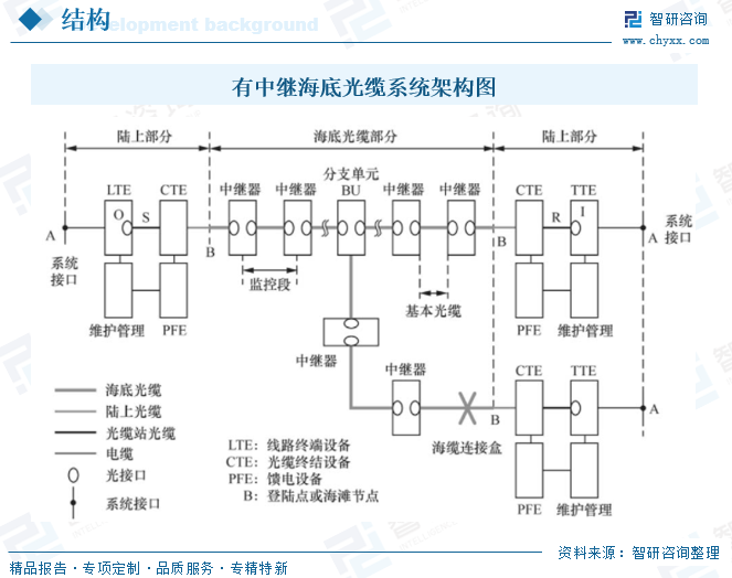 海底光缆通信系统按有/无海底光放大中继器可分为有中继/无中继海底光缆系统。有中继海底光缆系统通常由海底光缆终端设备、远供电源设备、线路监测设备、网络管理设备、海底光中继器、海底分支单元、在线功率均衡器、海底光缆、海底光缆接头盒、海洋接地装置以及陆地光电缆等设备组成。其中海底光中继器通常包含一个或者多个,是海底光缆系统中的重要组成部分。