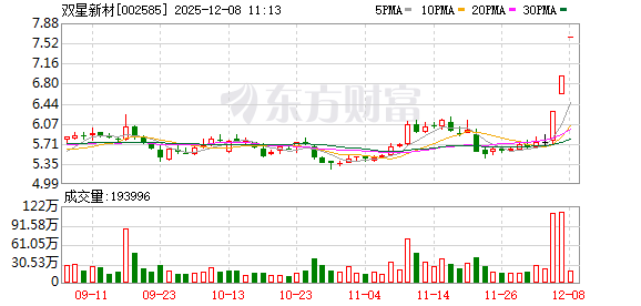 双星新材盘中涨停,已连收3个涨停板,截至9:31,该股报7.62元,换手率1.58%,成交量1402.66万股,成交金额1.07亿元,涨停板封单金额为2.12亿元。连续涨停期间,该股累计上涨32.98%,累计换手率为26.81%。最新A股总市值达86.97亿元,A股流通市值67.56亿元。