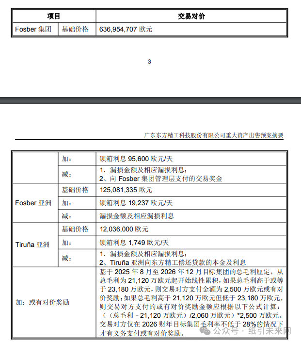 纸引未来网报道,近日,东方精工发布重大资产出售预案,拟以约63亿元人民币现金对价,向全球另类投资巨头博枫集团(Brookfield)旗下主体出售旗下Fosber集团、Fosber亚洲及Tirua亚洲的100%股权。此次交易标志着这家国内瓦楞纸装备龙头企业在完成海外业务整合与价值提升后,主动收缩国际战线,将战略重心转向国内科技与新质生产力赛道。