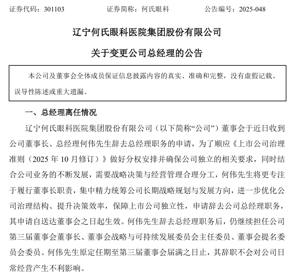 12月5日,何氏眼科(SZ301103)公告,为进一步优化公司治理结构、提升决策效率,保障上市公司独立性,何伟申请辞去公司总经理职务,其申请自送达董事会之日起生效。