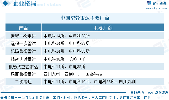 我国空管系统的自主开发起步较晚、发展比较缓慢,设备以引进为主,没有完善高效的管制系统设备。在20世纪70年代,我国自行研制了空管1、2号系统,但因可靠性不高,未能推广应用。20世纪90年代,在空管3号、4号系统研制项目中又成功研制了全固态PSR和MSSR雷达,系统性能已达到20世纪末同类产品的世界先进水平。目前国内空管雷达生产厂家主要包括中电科14所、中电科38所、中电科10所、长岭电子、四川九洲、四创电子、国睿科技等。其中,中电科14所及中电科38所经过多年发展,无论在规模还是技术上都取得了令人瞩目的成绩,目前产品已销往国内外许多地区。