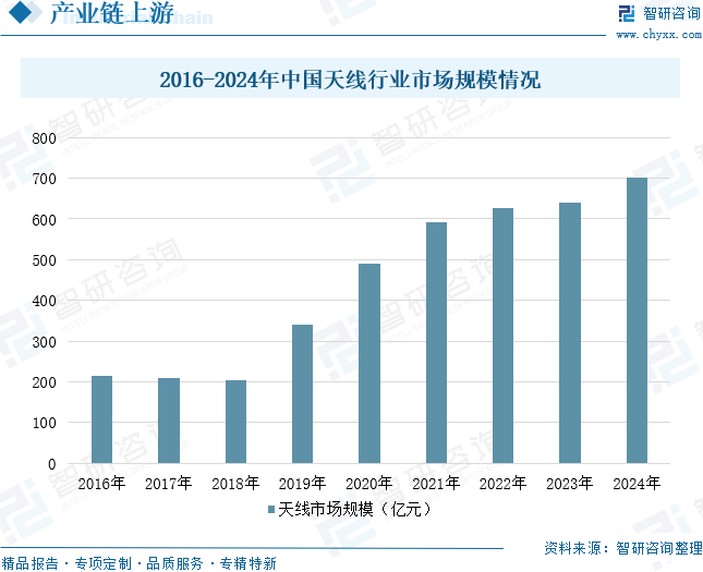 天线是空管雷达的“眼睛”,负责发射和接收无线电波。它由多个天线单元组成,可以集中能量并控制波束方向,从而实现对特定区域的扫描和探测。天线的设计直接影响到空管雷达的探测范围、精度和分辨率。天线是一种变换器,在无线电设备中用来发射或接收电磁波的部件。无线电通信、广播、电视、雷达、导航、电子对抗、遥感、射电天文等工程系统,凡是利用电磁波来传递信息的,都依靠天线来进行工作。近年来,随着通信技术的迭代升级,中国天线行业取得了显著的发展。数据显示,中国天线行业市场规模从2016年的215.45亿元增长至2024年的701亿元,年复合增长率为15.89%。未来,伴随天线行业技术不断进步与应用领域持续扩展,空管雷达行业也将迎来更广阔的发展空间和技术支撑。