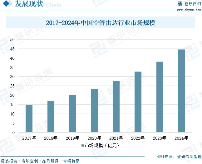 空管系统是民航管理部门实现空中精准指挥的核心中枢,占据民航空中交通管理产业链的中游位置。空管系统是利用技术手段对飞行器进行监视和控制,防止在空中或地面上相撞,并引导飞行器准时、安全起飞降落的控制系统。空管系统由多个关键部分构成,包括空中交通管理系统、通信网络、导航设施及监视系统。其中空管雷达是空管监视系统的重要组成部分。空管雷达在空管系统中主要负责信息搜集与传递,负责收集责任空域内飞行器的各类数据,并及时向飞行管制中心反馈,以确保飞行活动的安全高效。近年来,随着低空经济活动的日益活跃,传统监视手段已难以全面满足运行需求,而ADS-B系统、应答机及二次雷达等现代监视技术能够提供高精度实时飞行信息,协助空管人员准确掌握低空航空器动态,显著提升空域运行安全水平。在此背景下,中国空管雷达行业实现显著增长。数据显示,中国空管雷达行业市场规模从2017年的14.8亿元增长至2024年的44.5亿元,年复合增长率为17.03%。未来,随着低空空域改革推动通用航空持续发展,空管雷达需求有望持续增长。