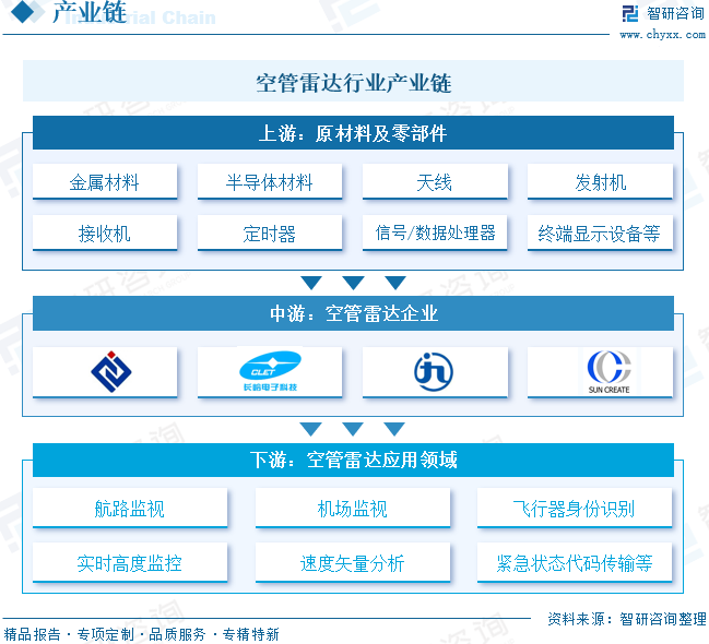 空管雷达产业链上游为原材料和零部件,其中,原材料包括金属材料、半导体材料等;零部件包括天线、发射机、接收机、定时器、信号/数据处理器和终端显示设备等。产业链中游为空管雷达的生产和制造环节,产业链下游为空管雷达的应用领域,包括航路监视、机场监视、飞行器身份识别、实时高度监控、速度矢量分析、紧急状态代码传输等。