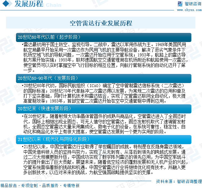 雷达最初用于国土防空、监视引导。二战中,雷达以军用作战为主。1949年美国民用航空局最早开始采用一次雷达作为民用飞机的主要导航设备,解决了恶劣气象条件下机场空域飞机的导航问题,一次雷达开始应用于空管系统;1953年,航路上的雷达导航方案开始实施;1955年,联邦德国航空交通管理局在机场附近和航路使用一次雷达,使空管员可以实时掌握空中飞行目标的相互位置,向航行管制系统的自动化迈开了第一步。20世纪60年代初,国际民航组织(ICAO)确定了空中管制雷达信标系统(二次雷达)的国际标准;20世纪70年代单脉冲二次雷达得以发展,为常规二次雷达的应用和普及打下坚实基础,同时计算机技术和雷达结合,实现了空管雷达联网全自动化,极大提高管制效率;1983年,首部空管二次雷达开始在空中交通管制中得到应用。在20世纪末,随着射频大功率晶体管器件的成熟与商品化,空管雷达进入了全固态时代,国际上相继出现全固态、可无人值守的空管雷达,固态发射机取代了速调管发射机,全固态空管雷达大量采用集成化、微电子化的设备,在系统可靠性、稳定性、自动化和商品化水平上有很大提高,使空管雷达发展到一个更为实用的阶段。21世纪以来,中国空管雷达行业取得了举世瞩目的成就。特别是在反隐身雷达领域,中国凭借科研人员的坚持与努力,实现了从无到有、从落后到领先的跨越式发展。通过二次大规模更新升级,中国成功实现了数字阵列雷达的领先应用,为中国空军战斗力的提升做出了巨大贡献。展望未来,随着低空经济的蓬勃发展和无人机产业的兴起,空管系统面临着新的挑战和机遇。中国空管雷达行业将继续优化现有技术,并融入更多创新技术,以应对未来的挑战,为航空强国战略提供坚实的支撑。