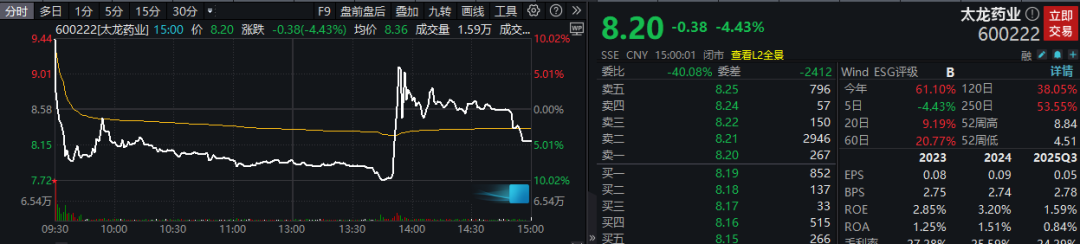 9日,以双黄连口服液出名的中药企业太龙药业以涨停价复牌,但很快该股股价直线跳水,迅速由红翻绿并于低位震荡。午后,太龙药业股价于盘中触及跌停,上演“天地板”,最终收跌4.43%。