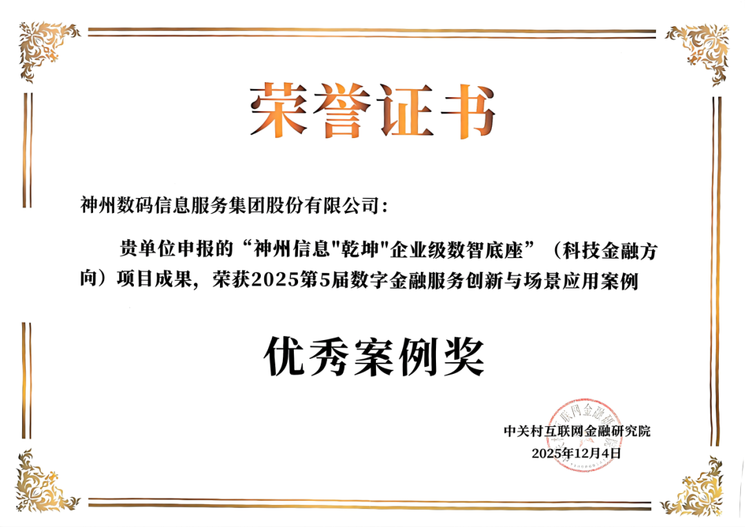 会上同步公布了“2025数字金融服务创新与场景应用案例征集”活动的最终结果,“神州信息‘乾坤’企业级数智底座”荣获2025第5届数字金融服务创新与场景应用案例优秀案例奖。此次案例征集共收获285个案例,经专家严格评审,64个优秀案例脱颖而出,其中技术类案例24个,聚焦人工智能、区块链等前沿技术的创新突破;应用类案例40个,涵盖普惠金融、养老金融等多个场景的落地实践。
