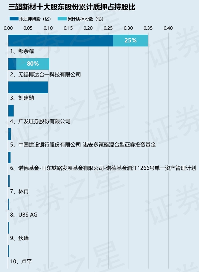 截止本公告日,股东邹余耀已累计质押股份873.54万股,占其持股总数的25.0%,股东无锡博达合一科技有限公司已累计质押股份820.0万股,占其持股总数的80.0%。本次质押后三超新材十大股东的累计质押股份占持股比例(占持股比例的计算以公司最新一期财务报表公布的十大股东的持股总数为基准)见下图:
