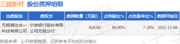证券之星消息,三超新材(300554)12月9日公开信息显示,股东无锡博达合一科技有限公司向宁波银行股份有限公司无锡分行合计质押820.0万股,占总股本7.18%。质押详情见下表: