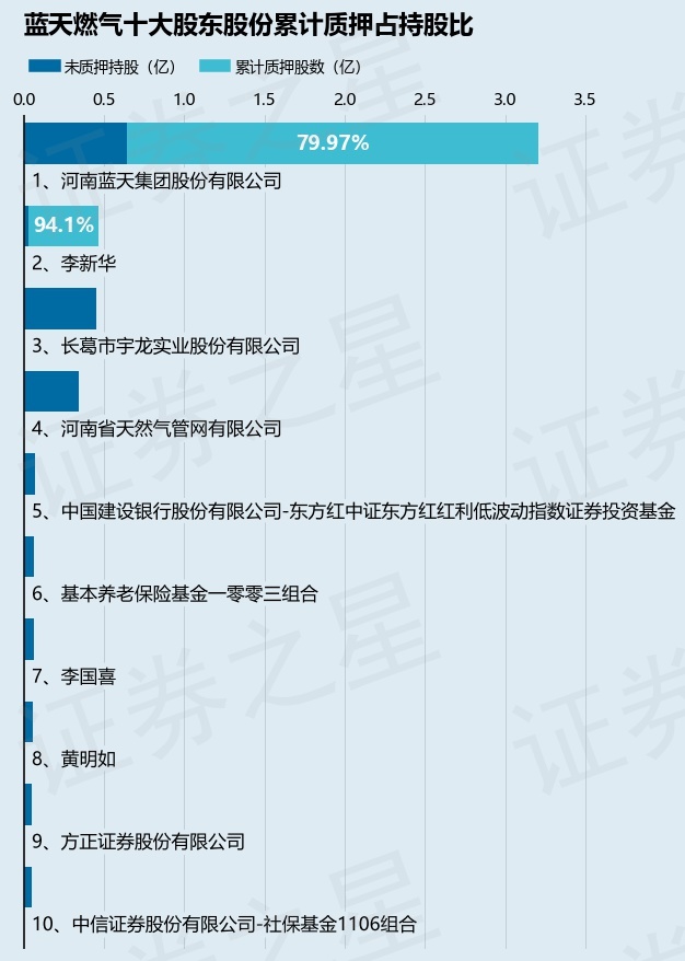截止本公告日,股东河南蓝天集团股份有限公司已累计质押股份2.56亿股,占其持股总数的79.97%,股东李新华已累计质押股份4400.0万股,占其持股总数的94.1%。本次质押后蓝天燃气十大股东的累计质押股份占持股比例(占持股比例的计算以公司最新一期财务报表公布的十大股东的持股总数为基准)见下图: