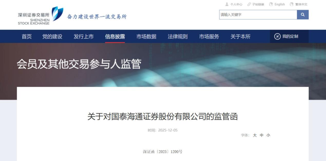 12月5日,深交所上市审核中心发出《关于对中节能铁汉生态环境股份有限公司及相关当事人的监管函》(审核中心监管函〔2025〕37号),由于披露的相关财务数据不准确,节能铁汉及其董事长、总经理等被采取“书面警示”的自律监管措施。