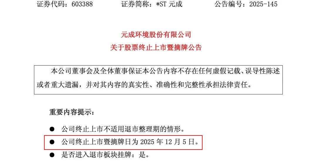 11月28日,元成股份收到上交所出具的《关于元成环境股份有限公司股票终止上市的决定》,决定终止公司股票上市。