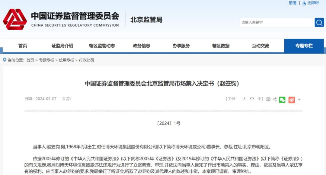 2024年2月7日,中国证监会北京监管局发出《中国证券监督管理委员会北京监管局市场禁入决定书(赵笠钧)》,决定对博天环境董事长赵笠钧采取7年证券市场禁入措施。
