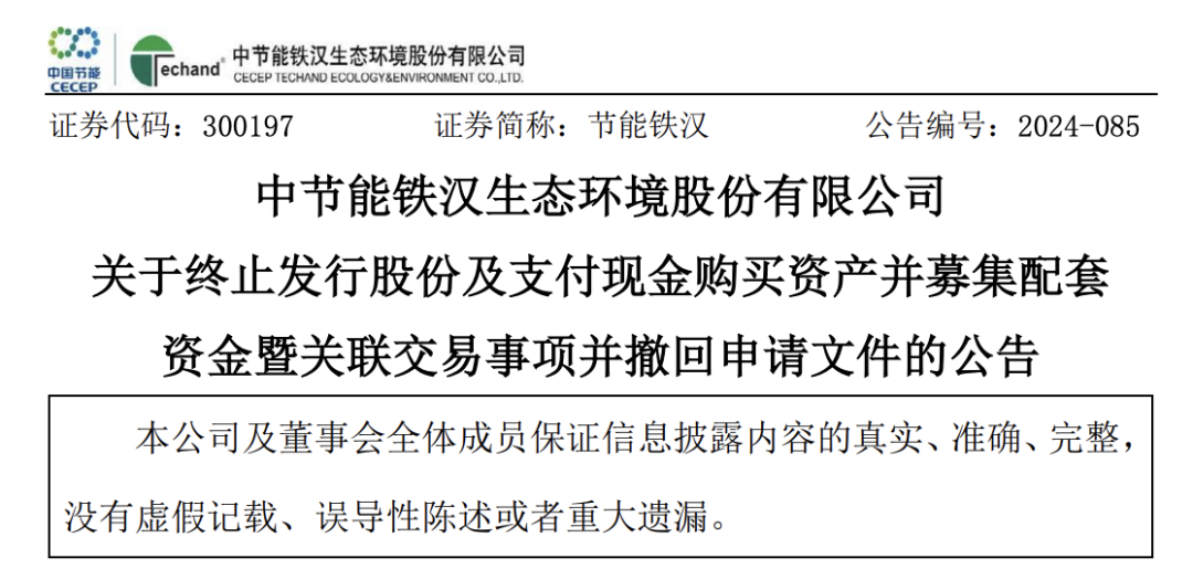 不过,到了2024年9月,由于“本次重组筹划历时较长,且国内外经济及资本市场环境已发生较大变化”,节能铁汉终止了这次收购,并向深交所撤回了相关文件。