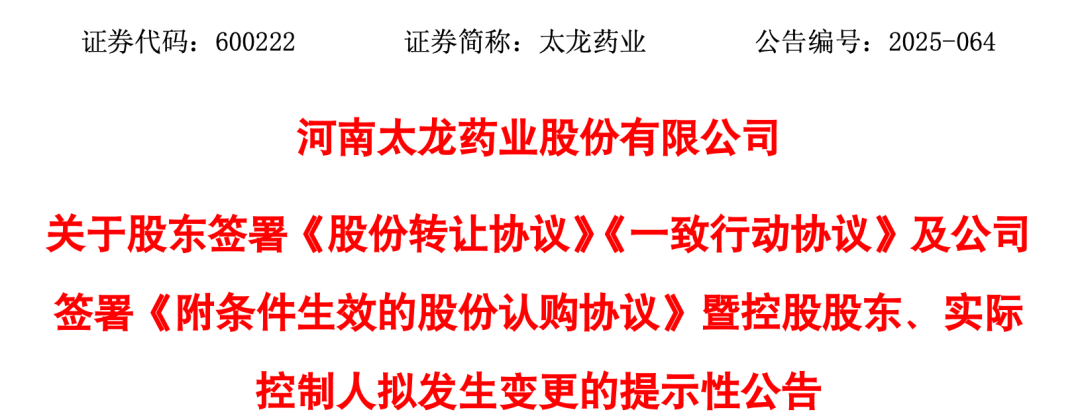 12月8日,河南太龙药业股份有限公司(以下简称“太龙药业”)发布控股股东、实际控制人拟发生变更公告。公告称,江药集团江西医药控股有限公司 (以下简称“江药控股”)将成为公司新控股股东,实际控制人也将变更为江西省国有资产监督管理委员会。