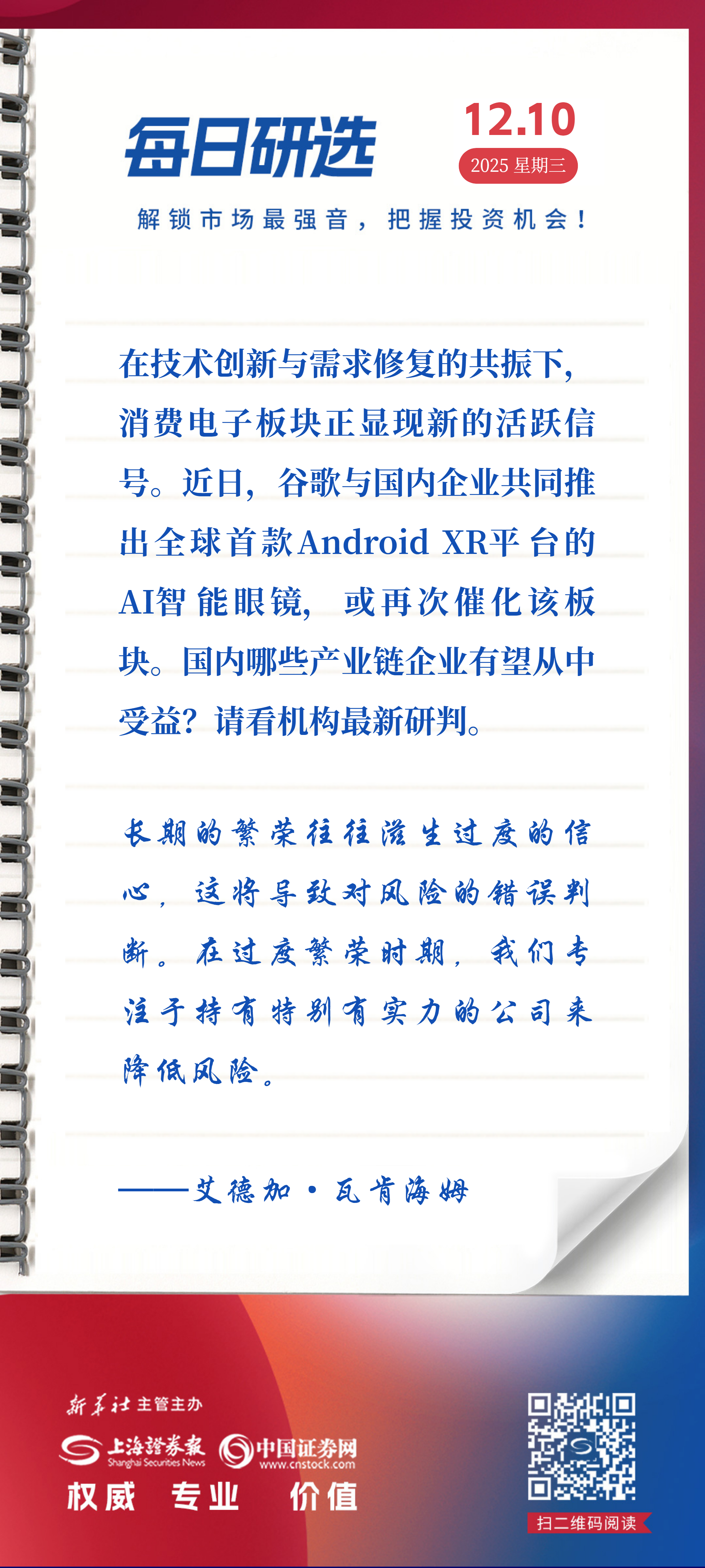 在技术创新与需求修复的共振下,消费电子板块正显现新的活跃信号。近日,谷歌与国内企业共同推出全球首款Android XR平台的AI智能眼镜,或再次催化该板块。国内哪些产业链企业有望从中受益?请看机构最新研判。