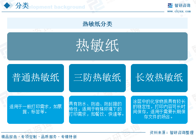 热敏纸又被称为热敏传真纸、热敏记录纸、热敏复印纸,在台湾则叫做感热复写纸。热敏纸是一种加工纸,其制造原理就是在优质的原纸上涂布一层“热敏涂料”(热敏变色层)。当热敏纸接触到热打印头时,涂层中的化学物质会因受热而发生化学反应,从而在纸面上形成所需的文字或图像。根据用途和特性的不同,热敏纸可分为普通热敏纸、三防热敏纸、长效热敏纸。