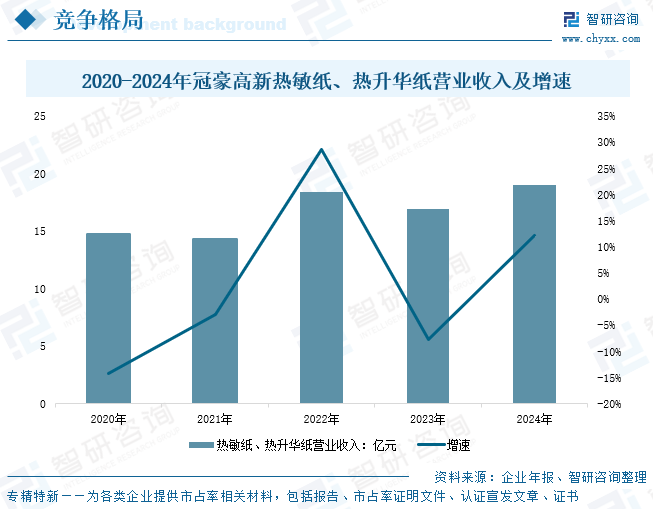 广东冠豪高新技术股份有限公司主营业务有特种纸及特种材料的研发、生产制造和销售。公司特种纸产品主要为热敏纸、热升华转印纸、高档涂布白卡纸等,热敏纸主要应用于票据、标签、传真等中高端细分产品领域。其中,公司自主研发的特种防护型热敏纸应用在中国体育彩票、中国福利彩票、民航登机牌等高端领域,并占据主要市场份额。经济防护型热敏纸在物流、商超、医疗标签等领域也占据国内主要供应商地位,产品广泛服务于中通、圆通、顺丰等多个知名快递物流企业。公司致力于通过科技创新和产品研发为客户创造价值,近年来,公司成功开发并推出的耐高温标签、热敏膜、医疗用热敏纸、高清晰成像热敏纸、耐刮擦热敏纸、无底纸不干胶热敏纸、无酚热敏纸等差异化功能型产品,已经在多个领域取得了显著的市场应用效果,并展现出广阔的市场前景。2024年公司热敏纸、热升华纸营业收入达到19.05亿元,同比上涨12.18%。