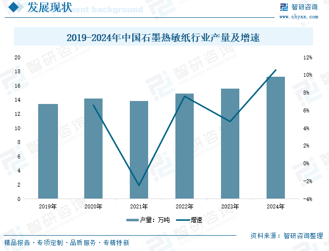 近几年,中国石墨热敏纸市场需求持续增长。一是电子商务与物流业的爆发式增长,带动标签、快递单等耗材需求激增;二是医疗、金融等领域对高精度、耐久性热敏纸的需求升级;三是环保政策推动下,传统含双酚A热敏纸逐步被无酚类、可降解产品替代。为了满足日益增长的市场需求,石墨热敏纸生产企业不断加大技术创新和工艺改进,行业产量持续上涨。数据显示,2024年中国石墨热敏纸行业产量达到17.2万吨,同比上涨10.6%。
