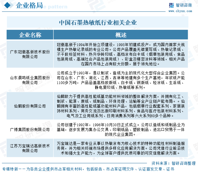 中国石墨热敏纸行业市场参与者众多,既有如 Oji、Koehler、Appvion等具备国际影响力的大型企业,也有大量以区域市场为主的中小企业。从地域分布上,企业主要集中在华东、华南和华北地区。以华东地区为例,上海、江苏、浙江等地凭借完善的造纸产业链、丰富的技术人才储备以及便捷的物流运输条件,吸引众多石墨热敏纸生产企业聚集。目前,中国石墨热敏纸行业相关企业主要包括广东冠豪高新技术股份有限公司、山东晨鸣纸业集团股份有限公司、仙鹤股份有限公司、广博集团股份有限公司、江苏万宝瑞达高新技术有限公司等。