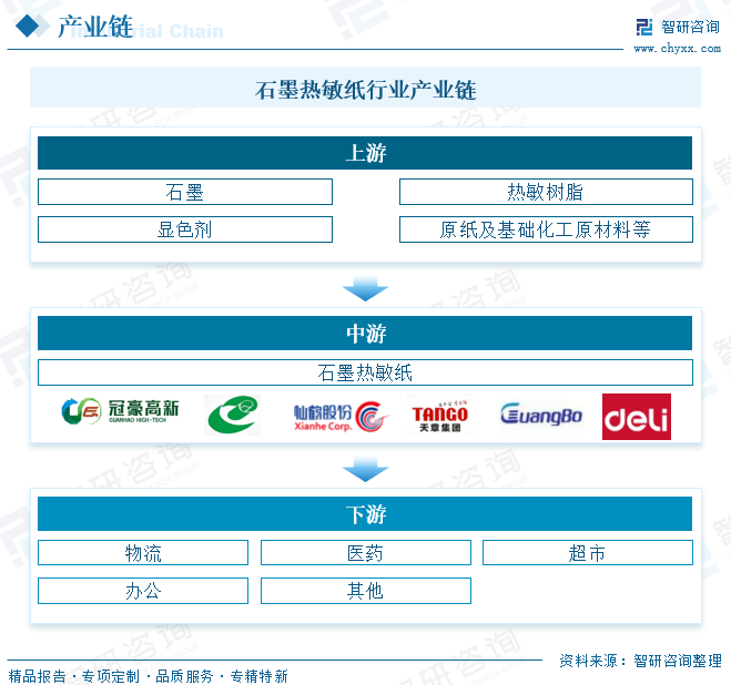 从产业链来看,石墨热敏纸行业上游主要包括石墨、热敏树脂、显色剂、原纸及基础化工原材料等。石墨等原材料经过加工后,为热敏纸的生产提供关键成分,这些原材料的质量直接影响到热敏纸的性能和品质。中游环节是石墨热敏纸的生产制造过程,涉及涂层、分涂、涂布、卷筒制作等工艺。通过先进的生产工艺和技术,将上游原材料转化为高质量的石墨热敏纸产品。下游是指应用领域,包括物流、医药、超市、办公等多个行业。
