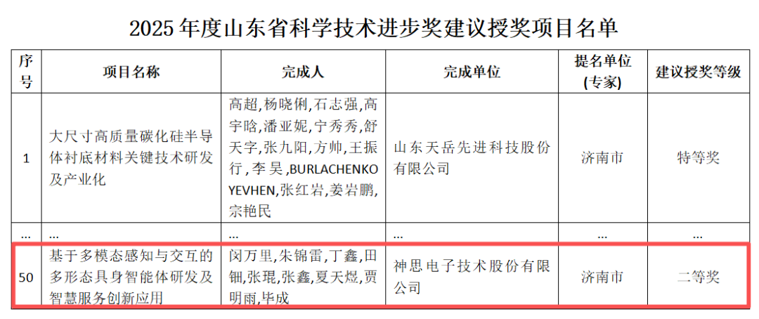 近日,2025年度山东省科学技术奖建议授奖人选和项目公示,济南能源集团所属神思电子公司凭借“基于多模态感知与交互的多形态具身智能体研发及智慧服务创新应用”项目,斩获山东省科学技术进步奖二等奖。这一奖项是对神思电子推进人工智能产业创新和赋能应用的高度认可。
