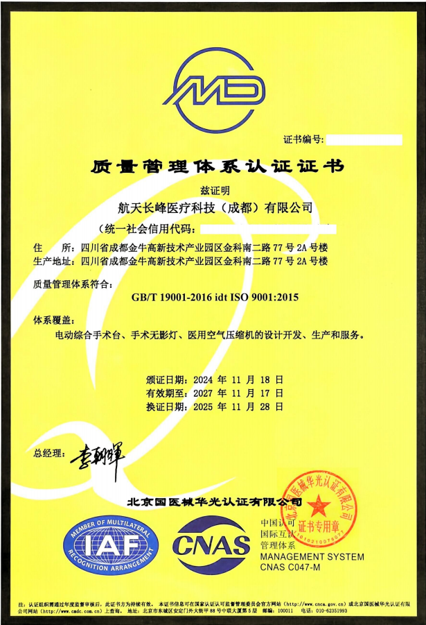 此次认证是对公司既有管理体系持续符合国际标准的认可,且体系覆盖范围在原有“电动综合手术台”基础上,新增“手术无影灯”“医用空气压缩机”两类产品。
