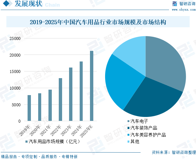 汽车用品产业作为汽车工业体系的重要构成,其发展水平直接关系到整车性能表现、质量保障与市场竞争力。21世纪以来,我国汽车产业整体高速发展,已形成涵盖多品类、全系列的整车生产与配套体系,产业集中度持续提升,技术能力显著增强,确立了全球汽车制造大国的地位。在此过程中,国家逐步加强对汽车用品行业的引导与规范,积极推动其产业化进程,重点鼓励包括汽车电子在内的技术密集型领域创新发展,并通过建立健全法规标准体系,持续优化行业竞争生态。近年来,在汽车保有量稳步增长、后市场渠道整合加速以及消费者认知不断成熟的共同推动下,我国汽车用品行业规模呈现持续扩张态势。数据显示,中国汽车用品行业市场规模从2019年的7800亿元增长至2024年的18000亿元,年复合增长率为18.2%,预计2025年中国汽车用品行业市场规模将增长至21200亿元。从市场结构来看,由于汽车电子种类范围广,其占比相对较高,达31.2%。其次是汽车装饰品和汽车美容养护产品,占比分别为28.2%和25.1%。