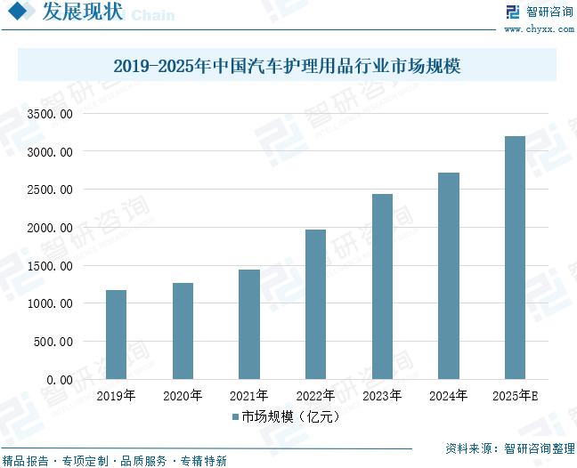 汽车护理用品是指为满足汽车在运行、保养、装饰等方面的需求而设计、制造和销售的各类产品。近年来,随着中国汽车工业的快速发展和消费者购车需求的增加,汽车保有量不断增加,为汽车护理用品市场提供了广阔的市场空间。与此同时,随着消费者生活水平的提高和消费观念的转变,消费者对汽车护理用品的需求也逐渐升级。他们更加注重产品的品质、功能和服务,对个性化、差异化产品的需求也越来越高。此外,随着汽车技术的不断创新和升级,汽车护理用品行业也迎来了新的发展机遇。数据显示,中国汽车护理用品行业市场规模从2019年的1177.8亿元增长至2024年的2718亿元,年复合增长率为18%。未来,随着汽车保有量持续增长与消费升级趋势的深化,中国汽车护理用品行业规模将保持稳健发展,预计2025年中国汽车护理用品行业市场规模将增长至3201.2亿元。