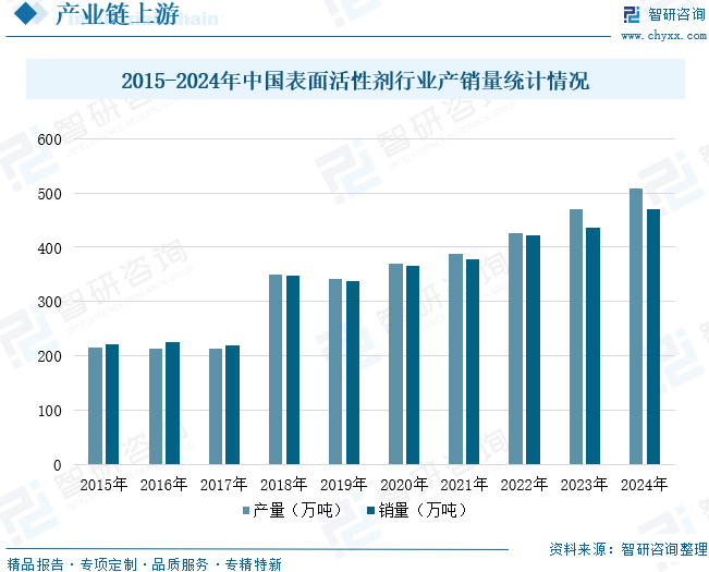 汽车护理用品的主要成分是表面活性剂,主要用于清洁和润滑。表面活性剂是一种能够显著降低液体表面张力或界面张力的化学物质,其分子结构具有亲水基和疏水基两部分,广泛应用于工业和日常生活中。虽然我国表面活性剂发展起步较晚,但在国家的支持及相关企业的努力下,市场呈现快速发展,目前已然成为全球表面活性剂产销大国之一。数据显示,中国表面活性剂行业产量从2015年的214.8万吨增长至2024年的507.64万吨,年复合增长率为10.03%;销量从2015年的220.6万吨增长至2024年的469.14万吨,年复合增长率为8.75%。未来,随着表面活性剂产销量持续攀升,将为汽车护理用品行业提供更加稳定、多元且具有成本效益的原料保障。