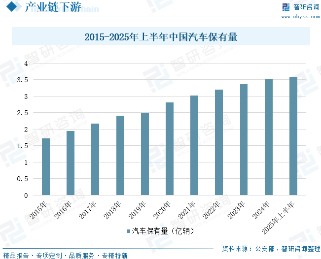 汽车护理用品主要用于维持车辆性能和延长使用寿命,涵盖清洁、润滑、保护等核心功能。近年来,随着国民生活水平的显著提升,国内汽车保有量激增。公安部数据显示,2015-2024年中国汽车保有量从1.72亿辆增长至3.53亿辆,年复合增长率为8.32%。2025年上半年,中国汽车保有量为3.59亿辆,同比增长4.06%。展望未来,在我国经济稳步发展与居民消费能力不断增强的背景下,汽车保有量有望继续保持稳定增长,从而为汽车护理用品行业提供持续扩大的市场基础与发展动力。