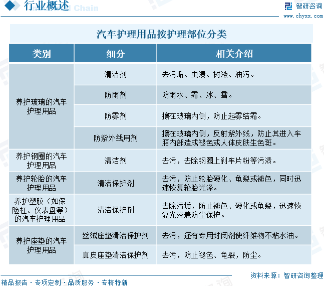 汽车护理用品是用于车辆各部件清洁、保养及功能维护的专用产品,涵盖发动机保养、制动系统维护、车漆防护等领域。根据护理部位,汽车护理用品可分为养护玻璃的汽车护理用品、养护钢圈的汽车护理用品、养护轮胎的汽车护理用品、养护塑胶(如保险杠、仪表盘等)的汽车护理用品、养护座垫的汽车护理用品。